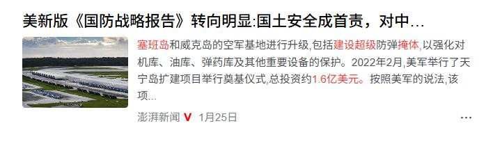 先别急着鼓掌,我看到的是另一盘大棋。 先看几个硬数据和事实,报告全文34页,对中国的描述从“头号威胁”转为“印太地区既定力量”;明确提出要通过军事对话“预防误判”、“建立护栏”;却同一时间,在第一岛链布防节奏丝毫未减:部署“堤丰”导弹系统,升级冲绳与三泽基地的战机配置。 甚至还大手一挥,拨出1.6亿美元在塞班岛建设超级掩体。 一边喊“和平”,一边加码备战。看表演的可以被骗,落子的人从不假手他人。 这个看似“缓和”的信号,其实是美方的主动战术调整。 它并不是害怕中国有多强,而是它真的打不起了。