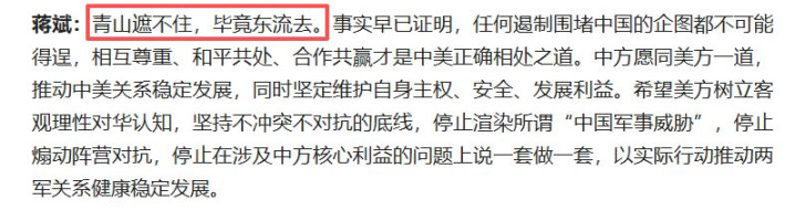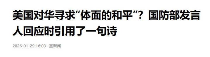 “谈,大门敞开;打,奉陪到底。” 1月29日,中国国防部在回应美国新战略时,特意引用了一句辛弃疾的词:“青山遮不住,毕竟东流去。” 这才是中国的定力与格局。 我们不会因为美国说了几句“好听话”就把战略收了,也不会因“岛链封锁”而乱阵脚。说到底,这场博弈比的是耐心,比的是综合国力和战略定力。 回顾过去十年,我们在高端制造、科技自主、军工能力现代化上的突破是实打实的。无论是舰艇下水速度,卫星发射频次,还是人工智能、无人平台这些新兴领域,中国都有了“硬刚”的底气与实力。 而这,正是美国想阻挡却阻挡不了的“东流”。